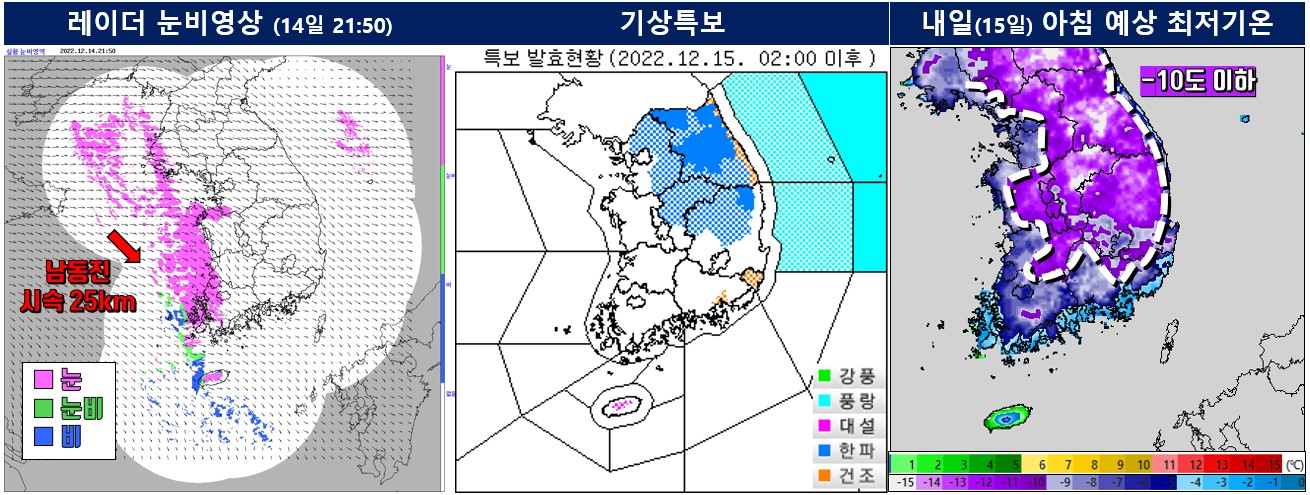 우선 목요일인 15일 날씨예보부터 알아볼게요. 전국이 대체로 흐린 날씨인데요, 오전부터 밤 사이 강원중와 남부동해안을 제외하고 중부지방과 남부내륙에 비 또는 눈이 내릴 전망입니다. 특히 오전 ~ 오후 사이 중부지방에는 많은 양의 눈이 집중될 수도 있다고 해요. 그래서 이 지역은 대설특보가 내려질 가능성도 있습니다.
