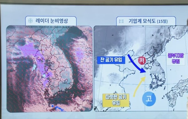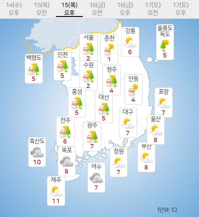 우선 목요일인 15일 날씨예보부터 알아볼게요. 전국이 대체로 흐린 날씨인데요, 오전부터 밤 사이 강원중와 남부동해안을 제외하고 중부지방과 남부내륙에 비 또는 눈이 내릴 전망입니다. 특히 오전 ~ 오후 사이 중부지방에는 많은 양의 눈이 집중될 수도 있다고 해요. 그래서 이 지역은 대설특보가 내려질 가능성도 있습니다.