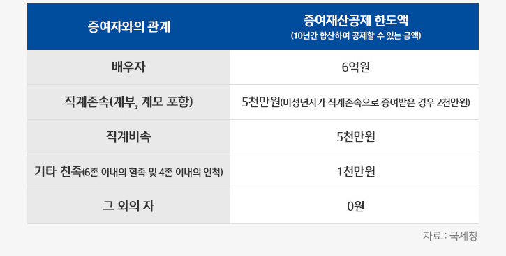 ■ 수증자가 증여자의 배우자인 경우, 6억 원, 직계존속의 경우 5천만 원(미성년자인 경우 2천만 원), 직계비속인 경우 5천만 원, 기타 친족은 1천만 원을 공제받는다는 얘기인데요.