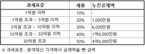증여세는 과세표준에 일정한 증여세율이 곱해져서 산출되며 증여세율은 1억원, 5억원, 10억원 단위로 10%씩 증가합니다. 이렇게 증여세를 계산한 이후에는 누진공제액을 공제하면 되는 것인데요, 예를 들어 보겠습니다.