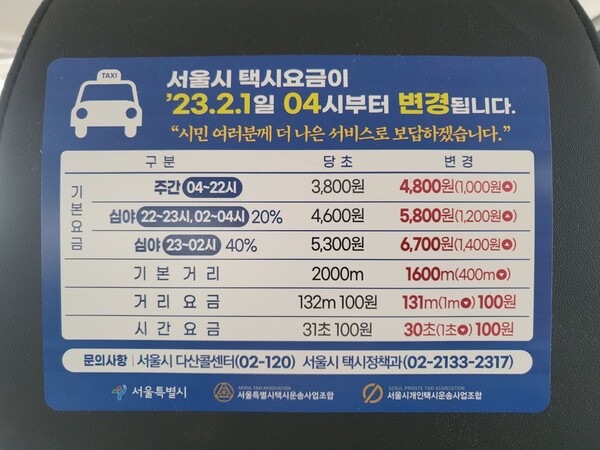 지난해 12월 1일부터는 심야할증 시작 시각이 자정에서 오후 10시로 2시간 앞당겨지기도 했는데요, 특히 오후 11시부터 익일 오전 2시까지는 할증률이 기존 20%에서 40%로 높이는 탄력요금도 적용되고 있습니다. 즉. 심야(오후 10시∼다음날 오전 4시)엔 할증 확대와 맞물려 요금을 더 내야 한다는 말이 됩니다.